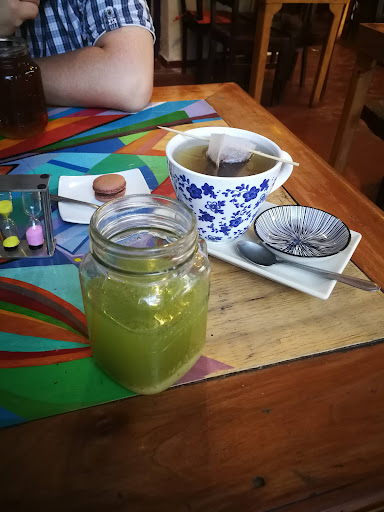 Read moreLa carta de té es lo mejor del lugar, muy variada y de buena calidad, y el despliegue para servirlos es bastante atractivo, hondos tazones con pinta oriental, reloj de arena para esperar a que cargue el tiempo adecuado, etc, el chai india estaba muy rico y reparador.El lugar es agradable, tiene linda decoración, una maleta con juegos de mesa. La estantería de libros podría tener libros más divertidos para ojear, la mayoría eran de turismo. La carta de pasteles estaba muy rica, el kuchen de nuez es un trozo grandote y muy dulce, se puede comer de a 2. Los rollos de canela muy frescos. Los macarrones son un poco pequeños, pero la factura es adecuada. Sólo no le doy las 5 estrellas por que la preparación del té matcha latte no estaba muy rica, le faltaba un poco de técnica, el liquido quedó polvoso y cargado lo que me sugiere que no fue lo suficiente batido, el té matcha tiene esa complejidad al ser concentrado en polvo de té verde, tampoco había una varilla de madera para revolver, ya que no está recomendado introducir una cuchara de metal a la mezcla para que no se amargue. En general es un buen lugar para ir a conversar, relajarse y beber ricos té - si no...