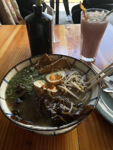 Lo malo: me comí un ramen miso vegetariano. El ramen es un plato fácil de arruinar pero tiene 3 puntos importantes a considerar; el caldo debe ser sabroso y consistente, los fideos tienen que tener buen sabor, y los toppings tienen que estar bien. El caldo estaba aguado; el caldo de un ramen miso se basa en la pasta de poroto de soja fermentado, que le da su sabor y consistencia, el resto son condimentos (y si se hace con amor se puede usar caldo de shitake y algas en vez de agua), y en este caso el caldo tenia algunas notas de jengibre y mucha salsa de soja(que no es lo mismo) y a penas si se notaba la pasta miso, no tenia sabor a aceite de sesamo o algun picante, y además tenia un sabor agrio dificil de identificar; el asunto con un caldo aguado en un ramen es que no alcanza a impregnar a los otros componentes de su sabor y el plato no cuaja. Los fideos eran fideos de arroz para pad thai, lo que quiere decir que eran fideos diseñados para adquirir el sabor del salteado y por ende no tienen sabor propio, ni mucho contenido de almidon; en conjunto con el caldo aguado e insispido, los fideos jamás iban a tener sabor. Los topping estaban ok; cebollin y brotes de soja, el huevo estaba a buen punto, y usaron alga china para saltear (de nuevo, no tiene mucho sabor, y se usa para adquirir sabor al saltearse), pero el tofu marinado? el tofu estaba agrio y oscuro, dos claras indicaciones de que estaba descompuesto y no apto para comer. No se sentia el sabor del marinado del tofu, solo el agrio que sobrepasaba todas las cosas.