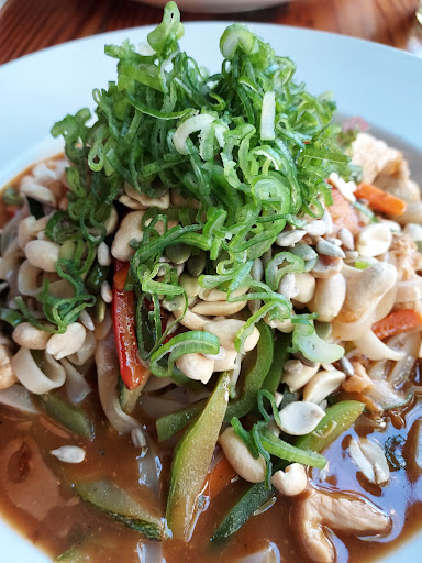Gluten Free diners: I was originally drawn in by the sign outside advertising "poke and Buddha bowls" but then was disappointed to find they are not on the menu. When I asked, they said they "don't have those items yet." False advertising! I enjoyed a refreshing ginger-mint lemonade while deciding on my order. I was told the samosas here do not contain gluten and are not fried in the same oil as items that contain gluten (but I didn't try them on my visit). Also was told the pad thai noodles are rice noodles cooked in water that wheat noodles are never put in. I ordered the pad thai without soy sauce (wasn't sure about the type of soy sauce so decided to be safe). When it came, it was a lovely dish and a large portion, but it was so salty I could only eat a small amount. I don't know why it would have been so salty, especially since there was no soy sauce! It's a very pretty restaurant with nice music and attentive staff. I might come back to try the samosas but overall my first visit was a...