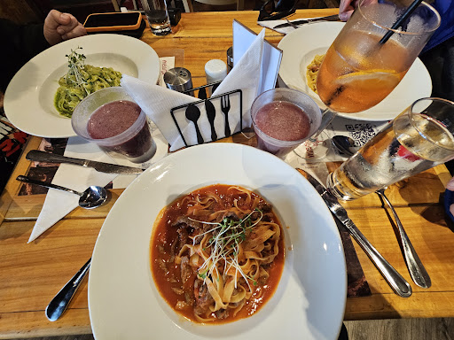Pésimo servicio. Les escribí para hacer una reserva para 15, me dicen que por el aforo tienen que ser en mesas para dos personas pero al llegar al lugar habían dos mesas grandes para 8 personas, dos adentro y una afuera... Habían dos personas esperando para ser atendidas siendo que había una mesa para dos disponible, con individuales, platos y cubiertos puestos. Se fué una mesa de a cuatro y las hacen pasar a esa mesa... Después de una hora nos acomodan en una mesa en la terraza que estaba esperando pagar hace 20 minutos... Luego de esperar sentados 20 minutos tuve que pedirle a la mesera que nos fuera aaatender y por su respuesta claramente se le olvido nuestra mesa... "ay disculpe" dice; luego nos tomó el pedido, eramos 6 personas en la mesa, pedimos cuatro limonadas menta Jengibre, dos pisco sour calafate, un pisco sour normal y un café. Para comer; tres fettuccine salsa de camarones, un fettuccine Patagónica y un tiramisú. Cuando llegan los bebestibles faltaba una limonada (se le olvidó) y el café llegó 10 min después con los platos. La limonada no tenia azúcar ni endulzante estaba super amarga, mala. 20 min después de que nos tomaran el pedido llegan los platos (eh eh que rápido, al fin algo bueno) Se le olvidó un fetuccine salsa de camarones y el tiramisú. Nos trajeron la pasta con cuchara pero nunca nos pusieron individual ni cubiertos, sacamos unos que encontramos por ahí. Tenía tanta hambre que empecé a comer con cuchara... No sé si estaba rica la comida, tenía mucha hambre o ambas. El fetuccine estaba muy rico a pesar de que la palta estaba un poco verde (me salió una parte dura) y el otro plato de fetuccine tenía caca de camarón que no le sacaron. El tercer plato de fetuccine llegó 15 min después. Casi se nos olvidó pagar ha ha ha. Fuimos a la caja ya que lo único que quería era irme de ahi lo antes posible pero no sin hablar con el encargado del restaurante. Cuando hablamos con el "encargado" (que estaba vestido igual que los meseros) fue super prepotente, se disculpa pero claramente le dió lo mismo todo y solo dió excusas. Que las chicas de la mesa para cuatro estaban esperando de antes y no había otra mesa disponible dice la mesera. Que estan probando gente nueva dice el encargado. Cuando pagamos la cuenta no nos cobraron el tiramisú pero el mal rato ya lo pasamos hace rato y pagar un poco menos no soluciona nada. Capaciten mejor al personal para que no se les olvide que mesas tienen, busquen mas personal si no se la pueden en temporada alta, avisen si hay demora de una hora o mejoren la logística agregando una persona que reciba a la gente y la lleve a la mesa pero no puede ser que pase esto en un restaurante de "4,5 estrellas" porque la verdad es que no lo parece. Hagan algo para mejorar la atención porque así definitivamente no...