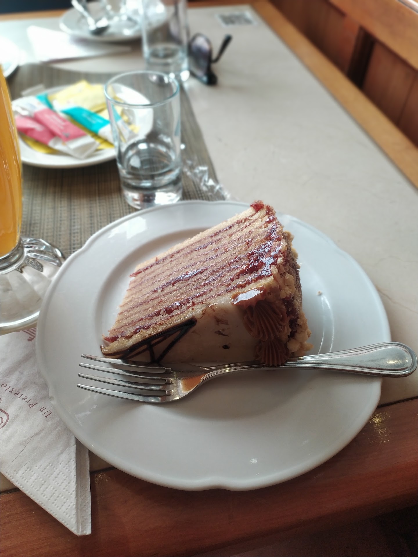 Nos comimos una torta de panqueque frambuesa y otra de chocolate, las 2 riquisimas y con una porción bastante generosas, en mi caso lo acompañe con un jugo natural de naranja y mis padres con un cafe cortado todo muy sabroso.