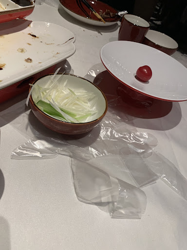 Schon am Eingang hängen die toten Enten im gläsernen Kühlschrank, und man läuft an den zubereitenden Köchen vorbei ins Restaurant. Sich mit den jungen herumalbernden Servicemädchen zu verständigen ist nahezu unmöglich, der Lärm und das Geklappere im kitschig gestalteten Innenraum nahezu auf Niveau einer Grossbaustelle. Lieblos wird die Bestellung entgegengenommen, und wer im Raum sitzt, wird ständig von irgendwas und irgendwem gestoßen und gestupst. Getränke? Wenn man ruft und zappelt, vielleicht. English? Moment, da kommen gleich 3 Mädchen und brüllen noch lauter in chinesischer Sprache, als ob man taub sei. Irgendwann kam die Pekingente, welche mit Plastikhandschuhen und einer 1/10 Portion dazugehörigem Gemüse und Sauce serviert wird. Der Geschmack ist allerdings super, Kompliment an die Köche, 4 Sterne! Die Miniaturen von Beilagen mussten wir jedoch 2x nachbestellen, wobei jedesmal 3 Servicekräfte bemüht wurden, die dann absichtlich riesige Portionen Gurkenscheibchen und eine Kanne voll Sauce auf den Tisch warfen, nicht stellten. Sorry wenn ich es so ausdrücke: Das ist unter aller Sau gewesen! Den zahlreichen lärmenden russischen Gästen schien es scheinbar zu gefallen, für mich ist dieser Stall trotz des leckeren Essens ein Reinfall, und definitiv nicht...