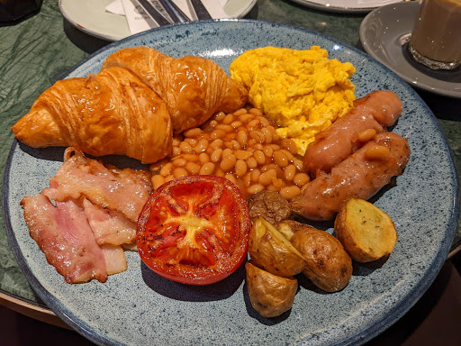 [全日早餐]4.5/5 出菜時仍有餘溫,茄汁豆帶微溫,蕃茄有煎香,烤馬鈴薯外表較乾內裡還好,培根感覺加熱不足水份有點多也比較油,牛角麵包外皮還有點微脆牛油量足夠也十分香,炒蛋幼滑度不足,比較上我還是比較喜歡加牛奶製作的炒蛋。