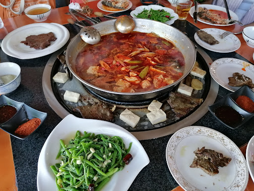 We had a wonderful meal here, the name on the sign outside is Dao Cha Huang Niu Rou 刀叉黄牛肉. We had a local speciality fish hot pot, I was cautious to start with, because I'm not usually that keen on fish hotpot, but this one was great. It had a tomato base to the soup, and had a local sour vegetable called mugua in it which was particularly tasty. The hotpot also had a ring around it that you could fry beef, tofu, and other things on it as well. I highly recommend the beef. It's right next to Erhai lake too, so try to get a seat with the view...