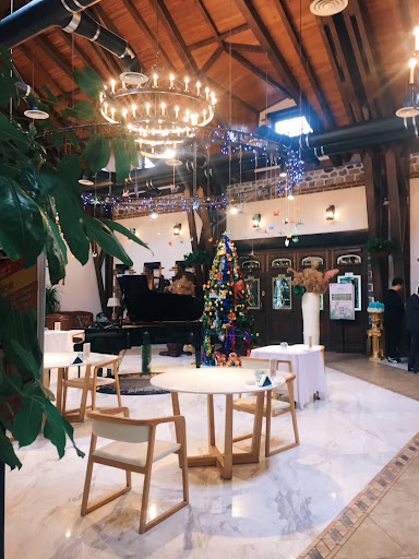 庭が樹木に覆われているカフェです。広場では結婚式が行われていました。私は日本からの旅行者...