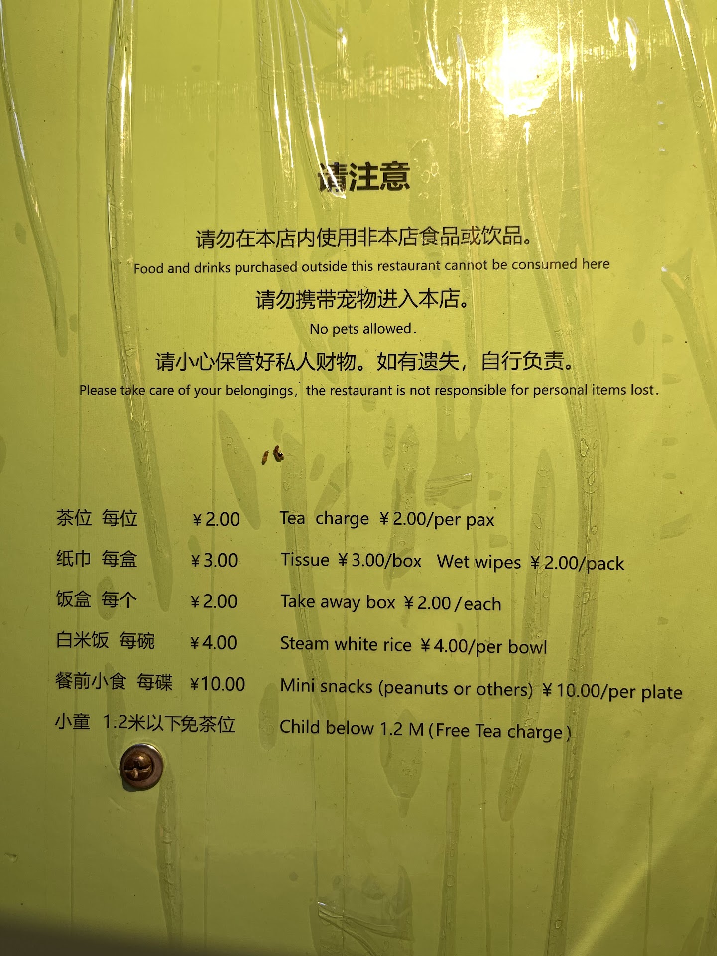 Costumers service is bad! I have gone to this place many times because is near to where I stay, but if wasn’t for this i wouldn’t move to go. In the times I have ate here they have forget my order. Once I waited for over an hr because the forgot my order no just one but twice that time, due to the amount of crowd you literally have to be chasing the waiters… and said I was not going back when I realized the charge for napkins!!!!! I have never been in a place where I have been charged for it even in poor and very small restaurants. It’s just 2 yuans but just put regular ones or make well numbers so you don’t have to put in the bill! After that experience…I read one side of the paper of the menu because they don’t tell you. Sneaky! So today I brought my own napkins that my hotel puts in my room for FREE!!!didn’t drink the tea they put on the table on purpose… just had the juice i order and the food and at checkout they wanted to charge me around 10 yuans, then I correct them and ask them why. Guess for them was unbelievable I didn’t drink their tea which I don’t like btw and didn’t used their napkins. So be aware and check your bill and ask where the numbers come from. Is not the cost of the napkins because is 2 yuans but they should be free at any restaurant!!!!!! This is part of your cost when running a business. ...