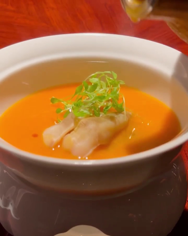 Each dish celebrates the original flavors of the excellent ingredients. The Orange Stuffed with Crab and Lotus Root, Crispy Fish with Plum Sauce, Century Egg with Steamed Eggplant in Tart as well as Handmade Prawn Roll, Cuttlefish Roll with Scallion Sauce and Garlic & Chili Sauce are four cold dishes that are great umami flavors – all served at the same time.