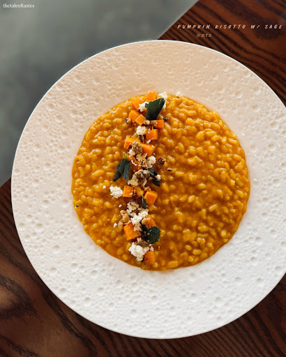 ✧ 𝙋𝙪𝙢𝙥𝙠𝙞𝙣 𝙧𝙞𝙨𝙤𝙩𝙩𝙤 𝙬/ 𝙨𝙖𝙜𝙚 (8/10) Richly indulgent yet light, the risotto melds creamy rice with unexpected bursts of carrot and citrus. Walnut and house ricotta crown this harmonious blend of flavors, a taste of autumn that nourishes.