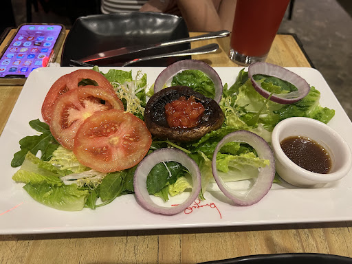 The portobello salad features a vibrant arrangement of fresh ingredients. At the center is a grilled portobello mushroom, topped with a small amount of tomato sauce or salsa. Surrounding the mushroom are slices of ripe tomato and rings of red onion, adding color and texture. The base consists of mixed greens, providing a fresh and crisp foundation. A small dish of dressing is placed on the side, likely for additional flavor. The presentation is clean and appealing, perfect for a light meal or appetizer.