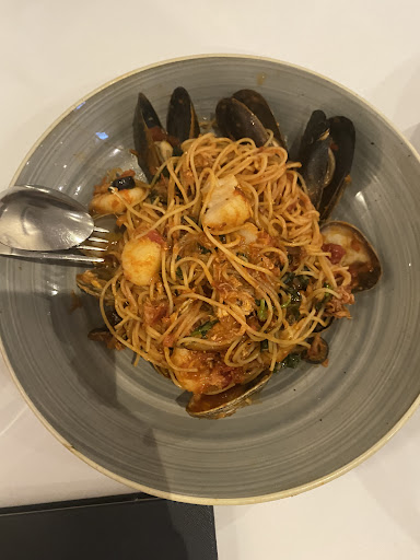 Seafood Capellini consisting of devonshire Crab, crystal prawns, scallops, clams lovers and basil, capellini having pretty strong tomatoes sauce with soft mild capellini, you get big shrimp, and clam