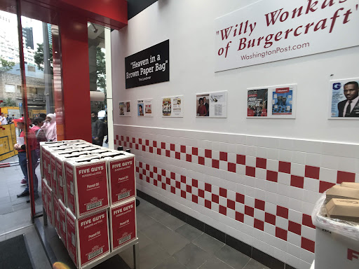 Read moreThis is my second time âtryingâ Five Guys. First time was back home in Seattle probably over 6 years ago and I remember I didnât think much of it so never went back. Decided to give it another shot since it arrived in Hong Kong. After waiting in the queue for about 35 minutes, we got our foot in the door. We then enjoyed cracking and eating the complimentary peanuts before ordering and waiting to get our food. All throughout the restaurant were photos of magazines praising and all these celebrities who love Five Guys. All the hype about the burgers, I was hoping for the best! Hubby got the regular bacon cheeseburger âall the wayâ which is a double patty with all the fixings. I got the little version with one patty and a large Cajun fries. They didnât have shakes available at the time. Bummer. What I loved was the size of the large fries. It came in an overfilled tall cup and spilled into the bag which Iâm not complaining about. I wasnât a fan of the Cajun spice and wouldâve opted for plain salt, but the fries were fresh and good. As for the burger, it had two slices of crispy bacon, halved into 4 pieces and stacked. The cheese is barely melted after getting your burger but let it sit in the foil wrapper for a minute or two before unwrapping. The burger tasted good, but itâs just not my burger-type preference. Maybe it wasnât juicy enough. The little burger was quite filling, but overall I thought it tasted just okay and quite expensive. Iâm glad I got to try it but probably...