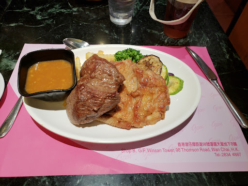 I went to this restaurant on a Saturday night for dinner. the restaurant is kind of dirty and dark, and the AC was not really strong enough on a hot summer night. however the food here is actually pretty good! I had a black pepper beef rice - I'm used to this dish being pre-sliced beef but it ended up being kind of a decent couple of mini beef steak portions that I had to cut myself. the beef was quite tender and above my expectations. I enjoyed the "appetizer" of borscht soup and garlic bread as well which a restaurant that feels like this usually does not serve. my wife had a set meal with a roast pigeon which also was pretty tasty with crispy skin. the milk tea was quite strong, which I prefer to milk tea that is basically just milk. the meal also included a dessert of green tea pudding with red bean topping, which was pretty decent for something I wasn't expecting. the service was so-so, except that they let us order the takeout menu for dine in as a set meal for an additional charge $30 HKD. one extra thing to note - they will automatically add a service charge of 10% to the bill here if...
