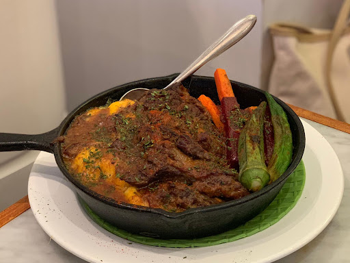 🥘Avocado Veggies Skillet The pan with a mixture of kale, mushroom, celery, cherry tomato, onion, home fries. The highlight is definitely the poached eggs, dissolved and blended in well with melted cheddar cheese and avocado. The potato add the crispy flavor to the dish and the layering of the paste food.