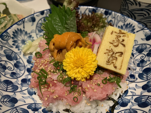 The dinner set we ordered was Sea Urchin with Onions Tuna Toro Bowl. Seaweed miso soup, garden salad and Japanese steamed egg were included in the set. There were quite a lot of minced tuna which was super smooth and delicious! I really liked the chopped spring onion and white sesame on top which greatly enhanced the flavours. The amount of sea urchin was quite generous and quality was not bad - smooth and creamy without any nasty flavour. There was also a piece of Japanese egg with the name of the restaurant printed on it, some fresh greens and a slice of pickled lotus root in addition to some sliced seaweed added to the rice. The bowl itself was so pretty and presentation was also very nice with a cute yellow flower placed in the middle.