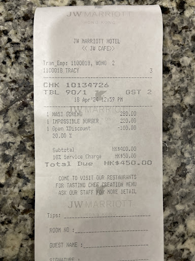 Read moreI've been struggling to give a review for JW buffet because it's a mixed bag. Pros: It has a variety of choices, cuisines, & it's definitely provided more options (I.e. cold seafood) than the usual lunch buffets. We sat by the side, which had a fantastic bird's eye view of the restaurant underneath and the outside. As for the food itself, I particularly liked its Peking duck, sirloin steak, fish maw, & its fruits & desserts. Cons: However, the biggest issue of JW Cafe was its overcrowded problem. It's difficult to manoeuvre at the food station & there's always a queue at every counter. Foods were not refilled quickly as there were lots of empty trays at the food station just after 1/2 hour. Dispite it has more choices than many usual buffets, but it's also more expensive than others. In addition, I didn't find anything was exceptionally tasty. Overall, I am the kind of person who would enjoy a good atmosphere more than the actual food itself when it comes to buffet. I like the interior decor of JW Café & the comfy seating area, but I hate the overcrowded at the food station & the supply of food definitely couldn't meet its demands on the...