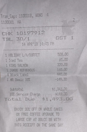 At this point, I made it known to the server that this is an unacceptable level of service from a JW Marriott establishment. Finally, the assistant manager came over to apologise for the slow service because they are busy. I had no choice but to inform her that majority of the tables were buffet diners so how can it be so busy for the kitchen to neglect ala carte orders? At this point it is already 12:55PM and still no lamb rack.