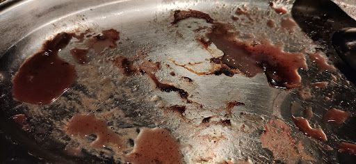 Steak on metal plate over tea candle although a nice gimmick rendered a bad result. The steak directly above the candle would ooze meat juices that curdle under the heat. The heat doesn't keep the steak warm one bit besides that 1 inch diameter section above it. Which is a good thing since you don't want your steak to keep cooking and drying out.