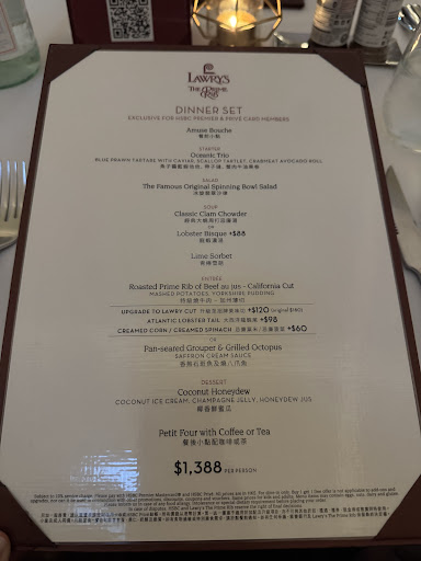 ย ย ย Read morewanted to love it but received disappointing experience here at lawryโs. food is fine but more on the service we received. after arriving for our 7:30 reservation, water was spilled all over the table (which is fine, understand everyone make mistakes and it was treated fairly quickly). but afterwards it took us more than 20 minutes for us to find someone to take our order, actively trying to look for a server throughout this time who were all busy with tables further away from us. also asked earlier for our wine to be opened for airing, but by the time we got settled and have the wine ready was 8pm.