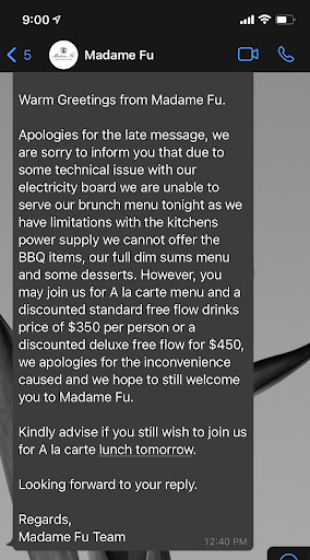 We decided to raise this complaint with the staff. They quite frankly couldn’t care less, and reverted back to the story about the power cut - however on pressing them and asking for the manager who then altered the story to say that the ‘power cut’ had in fact happened the day before, rather than today as they had earlier claimed and therefore they had only prepared ‘some’ of the food they needed for the brunch and not all of it - and therefore they had decided to prioritise giving all of the food to the big group and for go everyone else with an excuse. They seemed to think this was fine and didn’t see (or care) that they were misrepresenting the truth to customers!! After arguing with them for over an hour they did very little to compensate us. All that was offered was a measly 10% off - but with the inclusion of 10% service to the same bill - SO THE NET BENEFIT OF BIG FAT ZERO. We were absolutely astounded by this, but they couldn’t care less about the small people, only after the $$$$ from the big group. Very typical of HK attitude and service.