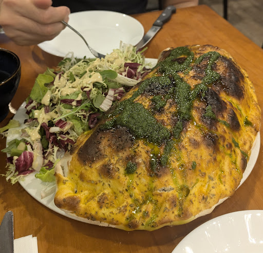 Weekday night, very bad weather, probably slow business day, I get it. But being a bit scammy and pushy about saving you money and getting more money from us made us quite uncomfortable. The service felt nice at first. The waiting staff warned us about getting a full calzone would be too big of a portion for 2 people so we got a half one, and indeed the portion was more than enough for 2! Then they asked, "What's for drinks?" We didn't want to order at first but they didn't seem to want to provide us with water without us asking, and we thought it would be nice to order more than just a calzone seeing that they probably didn't get a lot of business that day. But when I ordered the pear cider, they kept saying how the apple cider tasted way better and how it's different from any apple cider I would have drunk from other places. I trusted them and ordered the apple cider instead. My boyfriend then suggested we get both the pear cider and the apple cider so we did. Then they pulled out two big bottles of ciders, and I immediately understood why they wanted to talk me out of getting the pear cider. The apple cider had been opened and it had about 1/4 to 1/5 of it left, while the pear cider was a new bottle they probably didn't want to open. The apple cider was sour and stale with no bubbles, the pear cider tasted way superior. It's sweet and fresh, and had a hint of white grape! Then the calzone came and it's really big. We're glad we followed their advice. It looked really great too, and I emphasize on looked. Because it lacked seasoning or flavour. Inside of the calzone were a sh_t ton of white cheese, some ham, and some white mushroom. When it was cut open, I thought it was cream sauce that was oozing out. I guess they thought the cheese had enough flavour and the ham would add enough saltiness to it (they didn't). Even the dough lacked flavour or aroma of wheat flour. I felt like I didn't know what I was eating or why I was eating this. The staff also tried to get us order some sweet crepes as a dessert persistently, but we stood our ground and said no. I've never eaten a calzone but was intrigued because Ben Wyatt loves it. But it was a disappointing first time experience for me. And my boyfriend who had eaten calzones before confirmed that it was not a good one. Maaaaybe the pizzas and crepes are better??? i don't know and don't want to find out because I'm not going back there again. The French man sitting outside was kind and pointed us to the bus...