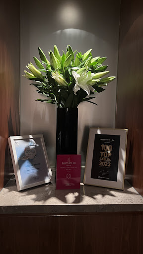 The attentive staff seated us comfortably, facing the talented chefs whose culinary symphony unfolded before our eyes. As we settled in, we couldn't help but notice the awards lining on their walls, proudly showcasing their consistent Michelin Star status for an impressive 15 years! ๐ It was evident that this restaurant was more than just a dining venue; it was a beacon of culinary brilliance.