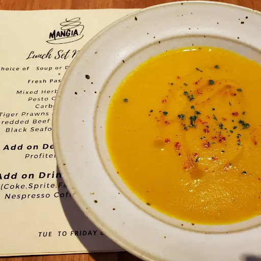 Read moreImpressive ~ fresh and tasty homemade pastas👍 Recently dined at Mangia and enjoyed its food and environment. The atmosphere of Mangia is casual and cozy, no fancy decor, all simple but comfortable. The staff members are extremely friendly and service was good. In terms of the foods I have ordered, from the creamy pumpkin and carrot soup as a starter, to the tiger prawns Aglio Olio as a main, was delicious; plus dessert, the homemade puffs (mini 菠蘿包) filled with fresh berry cream no doubt completed a happy meal. Such cooking standard is much impressed.