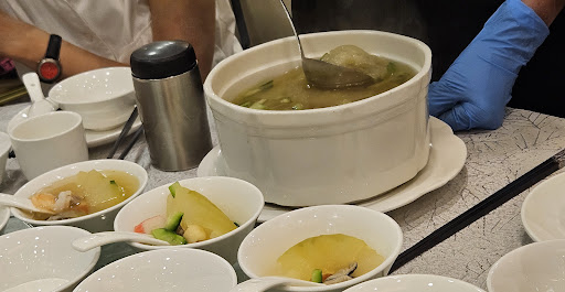 3.5 stars Our friends introduced this restaurant to us. They made a reservation 2 days before. Venue: A few minutes walk from Tram stops or Sai Wan Ho MTR station. Traditional Chinese restaurant setting. Not packed. Comfy seating. --- 7.3/10 Service: The manager read through the set menu for us to confirm all dishes. Each dish was served in sequence at the right time. Polite staff. The manager was always smiling. --- 7.7/10 Food: Normal presentation with garnish sometimes. Good portion. Winter melon soup: was nice, but not a whole winter melon. A waitress divided the soup for 9 of us. But some bowls (particular first 4 bowls) had more filling like prawns, lotus seed, mushrooms, etc. I got small pieces of winter melon, 1 Lotus seed, and pork in my bowl only. --- 7/10 Roast Goose, half: served with plum sauce. the Goose wasn't fatty. --- 6/10 Lobster with E-fu Noodles: not bad. The 2 lobsters were cooked well --- 7.6/10 Sweet & Sour Pork: fair. --- 6/10 Stir-fried Lotus root with Liliy bulbs, black fugus, and celery: ok but small portion --- 7.3/10 Steamed Spotted Cod: Steamed the fish very well. As our request, soy sauce was served separately. --- 9/20 Osmanthus & Goji Jelly: good. Not too sweet. A lot of goji...