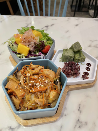 Read moreLovely green space with lots of indoor plants even if you were in the middle of concrete jungle with skyscraper around you. The lunch hour is pretty packed so definitely come early. No reservations allowed. Come before 1pm definitely. At 12pm its empty. There are 4 set lunch, and usually some kind of mock meat with rice, pasta/noodles with side salad. With a complimentary choice of soup or drink. Food is average, I'm on a foodie side, and I can cook, so I'm a bit more picky when it comes to judging food. I would say for the convenience, location and price (around HkD68 to HKD78 for lunch) that's decent. If there are healthier choice with less refined carbs and avoid using soy gluten products, I would go there instead. Staff was polite and helpful, crowd tends to be local professionals. Pros: environment, high ceiling and reasonable price. Cons: Food choice and lack mock meat/ processed...