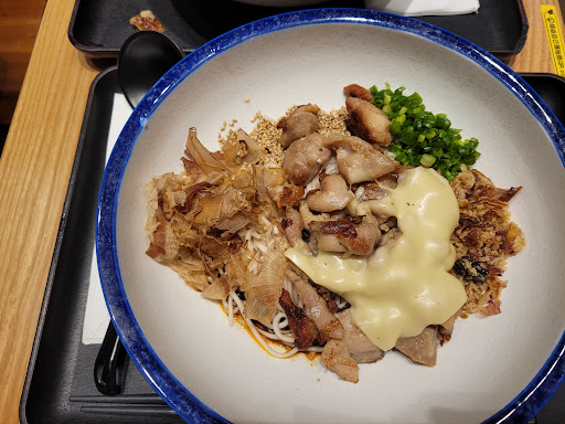 I have tried the dry noodles with chicken fillets and cheese. The chicken was served in small, tender and juicy cubes, with crispy and smoky skin. It matched perfectly with the molten cheese.