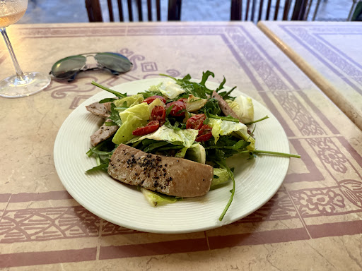 The glassware is beautiful, and the wine is served perfectly chilled, allowing you to savor it to the last drop. I had a tuna salad, which was delicious. The service was attentive and friendly. The owner, while appearing a bit grumpy, is clearly a skilled operator running a well-managed business.