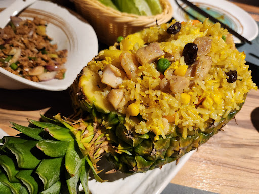 Thai Pineapple Fried Rice – $138 Presented with a side of pork floss and cashew nuts for custom seasoning, this dish is layered with textures and flavors. Inside the rice: plump prawns, sweet raisins, and diced Chinese sausage, all stir-fried to a perfectly dry consistency. Each grain is distinct and lightly golden, with just the right balance of savory and sweet. The crunch from the nuts and the optional pork floss elevate the dish further, making it a standout among classic Thai...
