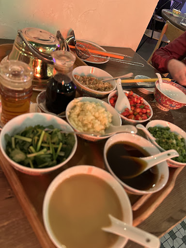 Read moreWhile the atmosphere is cosy, and decor is cute, we didn’t get a very good feeling of the place. It’s very costly and lacking some essential classic hotpot options. (No chili crisp oil, no lamb, no peeled shrimps and mussles and no seaweed fungus etc..) the homemade rice noodles were short and stringy and maybe the best ones I’ve ever had. Even for dipping sauce you have to pay extra to fill it up. But the dipping sauce tray on the welcome table was lovely looking. Soup was tasty but not amazing. I wanted to try the chicken coconut soup but they do not offer it as ”half” a soup and my friend is vegetarian so we were sticking to other soups, unusual ones. So it’s unique and nice and...