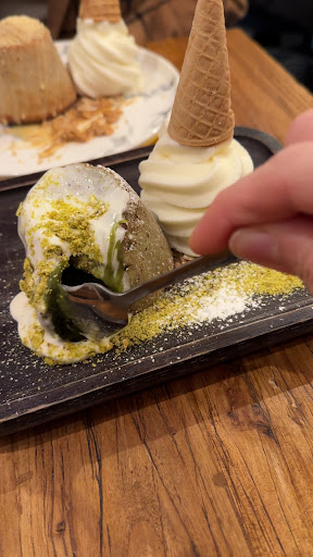 There are numerous flavours of molten lava cakes and we tried 2 of them, pistachio and caramel, peanut butter. Both flavours are good, strong and sweet. It is very melty in the centre which is exactly how lava cake like. But, the texture is very weird, rubbery and stiff. The yogurt ice cream is also not matching with the cake. The sourness and the icy texture don’t fit with everything about the cake. Maybe the waffles or the other sweet soup will taste better. I am also a bit upset with the arrangement of the waiters. There is a big group of people coming in after my friend and I sat down, whom I believe they have made a reservation/a call. We then were squeezed into a corner with a shop overwhelming with people. If the waiter have informed us of this, we would have ordered takeaway. Basically I won’t revisit...