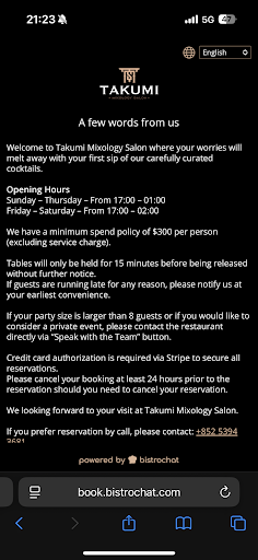 Read moreUnfortunately, we were not able to get in this place, we were dressed smart casual as I would to go everywhere for an evening out, long chino, smart shirt and SANDALS. This was the mistake, doesn’t matter how smart you dress, if they can see your feet, this is the big taboo. And it also doesn’t matter if outside there are 33 degree and your outfit would have been considered smart in every Mediterranean yacht club. We booked through google and at no point there was an information regarding strict dress code, nor in the confirmation email like many places do. The server was quite rude communicating this information. He was huffing at us impatiently. The manager politely came to talk to us showing us their policy on a tablet. But made no concession. To NOTE, if you go on their website, this policy need to be found. Is not written in the front page, is not written when you start the process of booking through their website. Is it going to be written at the end of the booking? NO. I attached another booking I made for next week. First picture is homepage, second picture is the confirmation of the booking on their website and last picture is the confirmation text. Finally, you find also their confirmation email. No information about this strict dress code. Thank you, for having a policy that makes no sense in tropical weather in a tropical city. Even more, thank you for having this policy that you don’t bother...