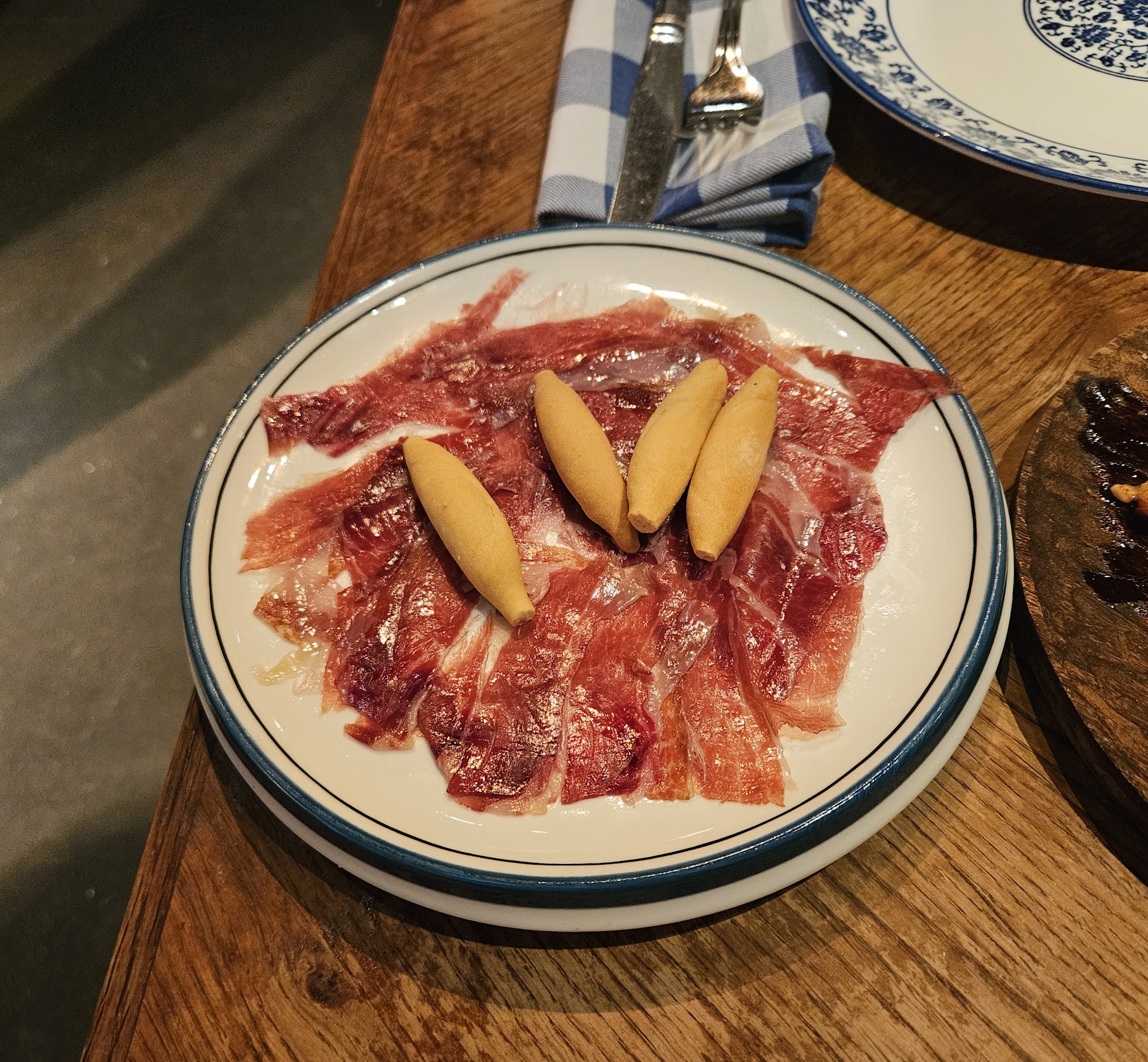 Then we told the wait staff that we wanted to move on to appetizers - i felt like they should’ve asked us instead of us asking them. We waited for a bit for the appetizers. We got the: PAN CON TOMATE WITH JAMON (Coca bread, tomatoes, olive oil, Iberico ham): this was good! The bread was well toasted and the proscuitto pair was amazing TRUFFLE "HUEVOS ROTOS" (V) (Crispy potatoes, sunny side up eggs, fresh shaved truffle): i thought this was just okay. The potatoes were not crispy but soggy instead? I felt like this dish lacked flavor OCTOPUS CROQUETAS (Seafood squid ink bechamel mayo): this one was also okay. There wasn’t a flavor that stood out KING PRAWNS AL AJILLO (king prawn in chilli oil): this tho, the star of the show. The prawn was fresh and cooked perfectly. The saucr was so really good and it didn’t taste oily!