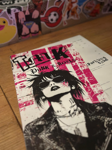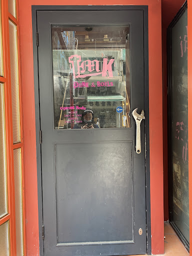 Look at how cool the door handle is, this wrench will take us to a different world, entering the world of rock n roll. Walkin up the stairs, you can see the giraffiti and stickers on the wall, then you can see this giant beauty behind the window.