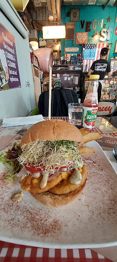 Their mainstay is a beetroot burger with a handful of sides, all served Chili's Restaurant style. It's pricey and the portion size ensures you'll be able to finish it. Check out the their website veggiesf com to get a sense of the place. Tables are tight so plan on getting to know your neighbor. It's Buddhist run, so no alcohol.