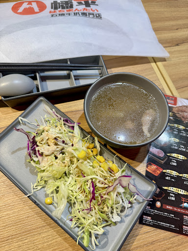先在門外看餐牌,老闆在入口的購買機旁協助及簡介選餐及付款(八達通/現金),再安排入座。牆上有牛各部位的掛畫及告示如何石燒牛扒,石燒及牛扒亦很快送上。