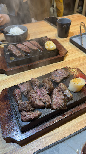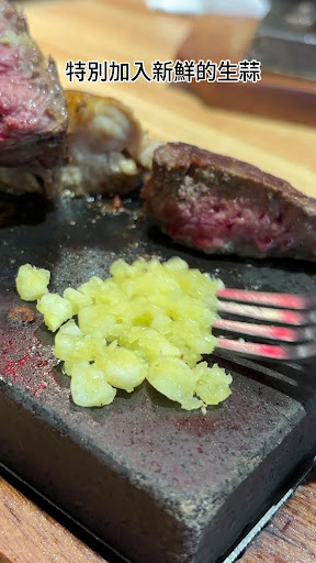 八幡平招牌牛扒🥩 牛扒上枱時大約3-4成熟,而黑色石板非常熱,小妹先將牛扒切成小塊,再用石板烤熟,以令每塊牛扒🥩燒得均衡😆...