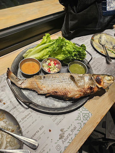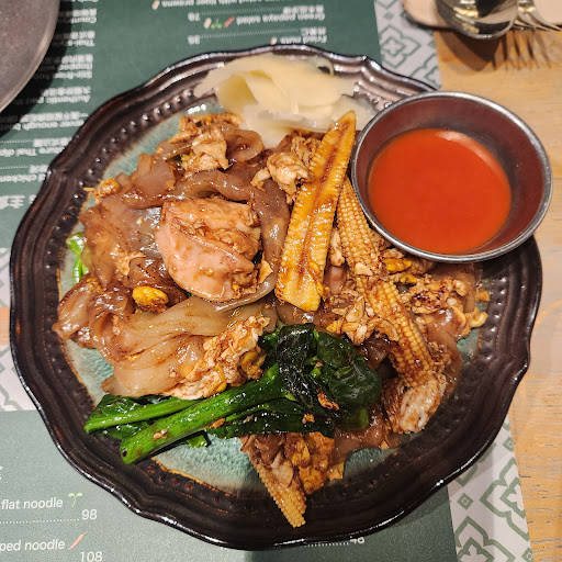 We ordered an appetizers (Thai Duck Salad), 2 mains (stir fried chicken flat noodle, Thai green chicken curry Tsukemen and nan bread) and 2 drinks (butterfly pea lemongrass soda and soda Zaab) to stare, and ended up order 2 more dishes (boat noodle, grilled pork neck) AND a dessert (sticky rice with mango) just for 2 people. i was stuff up to my neck but it was worth it. The food was really good and tasted pretty authentic. I was a little disappointed at the "Tsukemen" part as I thought there were more options or an actual dish, but its basically a side of noodles you can order with your curry. The funny thing is the noodle comes cold so when you dip and eat it with your curry it becomes lukewarm. Dont get my wrong, The curry with the noodles were really good and we couldnt get enough of it. As with all the other foods.I still think Samsen tastes better, but this place is a close second.