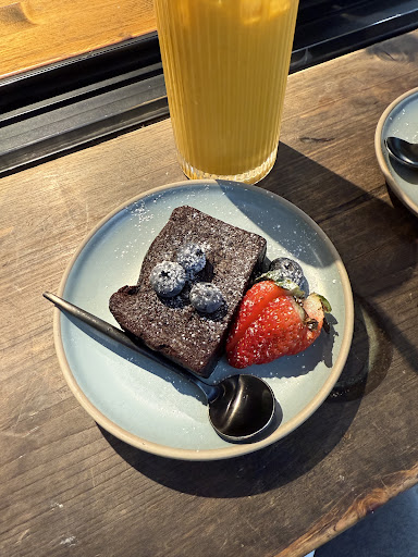 The atmosphere is chill but with a "vibe" and background energy which can make it a great social spot, the location is fantastic as it's off the main streets enough to not be bothered by noise but isn't directly opposite a refuse center unlike another coffee shop around the corner. Plants are kept in the surrounding area giving a nice colour to the otherwise gray city and overall it's very enjoyable.