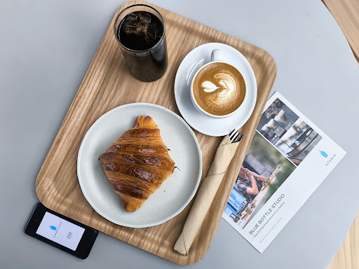 The upper seating area was already closed off at the time I arrived and limited menu selection - just over half an hour time before closing. The employee brought the stuff over even though they initially handed me the beeper. Much preferred than having to get up and carry to the table oneself. The dishware didn’t quite match the aesthetic of the cafe but it’s cute - when you life the mug, there’s a …blue bottle. 😄 Overall, a minimalist looking cafe in a modern...