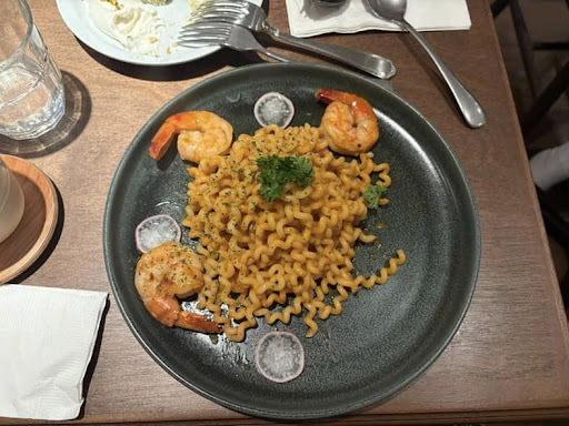 Pasta: Mediocre. Searching for any hint of flavour as the meagre amount of sauce was left at the bottom of the plate, leaving us chewing plain pasta. The frozen shrimp had more flavour than the pasta.