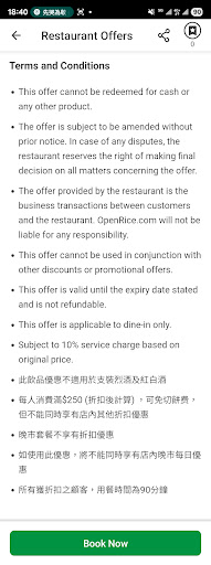 Discount Dishonored We booked through OpenRice which advertised a 20% discount. Upon arrival, we confirmed with the staff that the discount would apply. The waiter said he needed to check with the boss but never followed up or gave any warning about “conditions.” At billing, the discount was removed. The boss insisted this was because we “stayed longer than 90 minutes.” Yet,