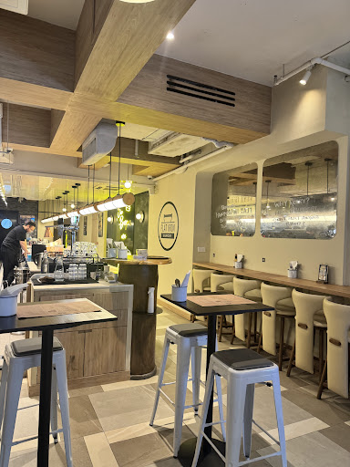 The ambiance of the restaurant is lively and modern, making it a great spot for both casual dining and a quick bite with friends. The seating is primarily high tables and counter-style, which adds to the casual vibe but might not suit everyone’s preferences. If you enjoy a more relaxed dining experience, just be aware that this setup might not be your ideal choice. However, for those who appreciate a more social atmosphere, it’s perfect!