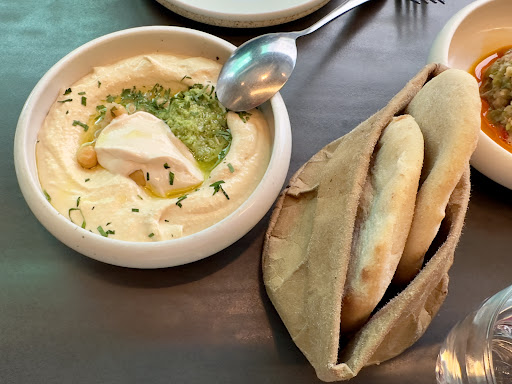 Ordered : hummus : fine but felt diluted, more liquid than we like it. Portion fair but remember it’s 90 hkd for a hummus… falafels : 4 pieces with a bit of hummus, nice, same thing 22,5 hkd for one falafel and not that big, burnt eggplant : not amazing, average and quite small portion for 90 hkd, baby calamari : nice and generous in size but remember it’s 150 for this mezze…