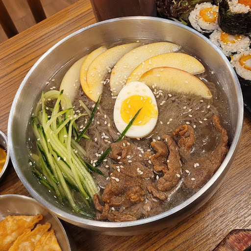 韓式蕎麥水冷麵是炎炎夏日的最佳選擇,韓正屋韓國料理使用道地韓國蕎麥麵,煮熟後再以冰水搓洗,輕鬆消暑開胃之餘,口感彈牙,蠻不錯的。蕎麥麵上頭的牛肉、蘋果片、青瓜絲、雞蛋酸甜鹹三味一體,使蕎麥麵風味變得更加豐盛,清爽怡人。