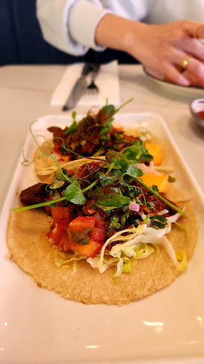 ใ Al pastor pork taco ใ45 Delight in the Achiote Roasted Pork, complemented by pickled onion, fresh tomatillo salsa, fiery habanero, and earthy beetroot sauce. This refined dish, meticulously crafted, is a harmonious blend of flavors, not sloppy at all.
