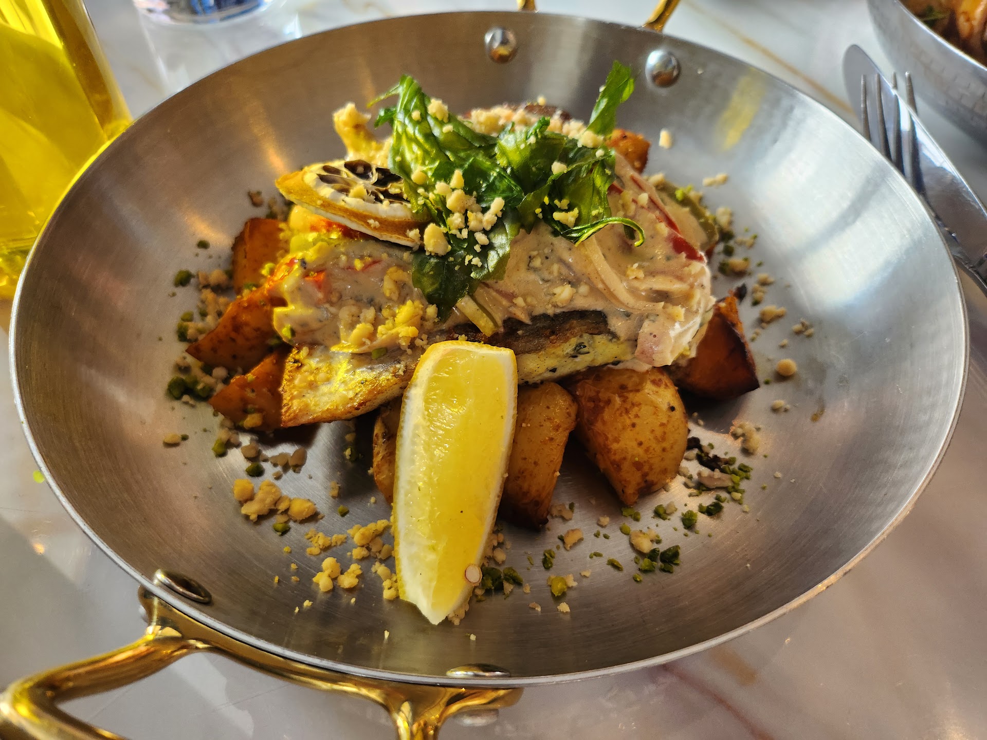 The Lebanese fish, on the other hand, was a more elaborate affair. The fish was served with a variety of vegetables and salad dressings, as well as roasted potatoes. While the fish itself was tender and well-cooked, the abundance of sauces and accompaniments made the dish feel a bit overwhelming in terms of flavors.