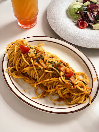 🍝spicy italian sausage spaghetti the sauce was rich and savoury, and the sausage added a nice kick. portion was much bigger than expected. v impressed by this dish!!